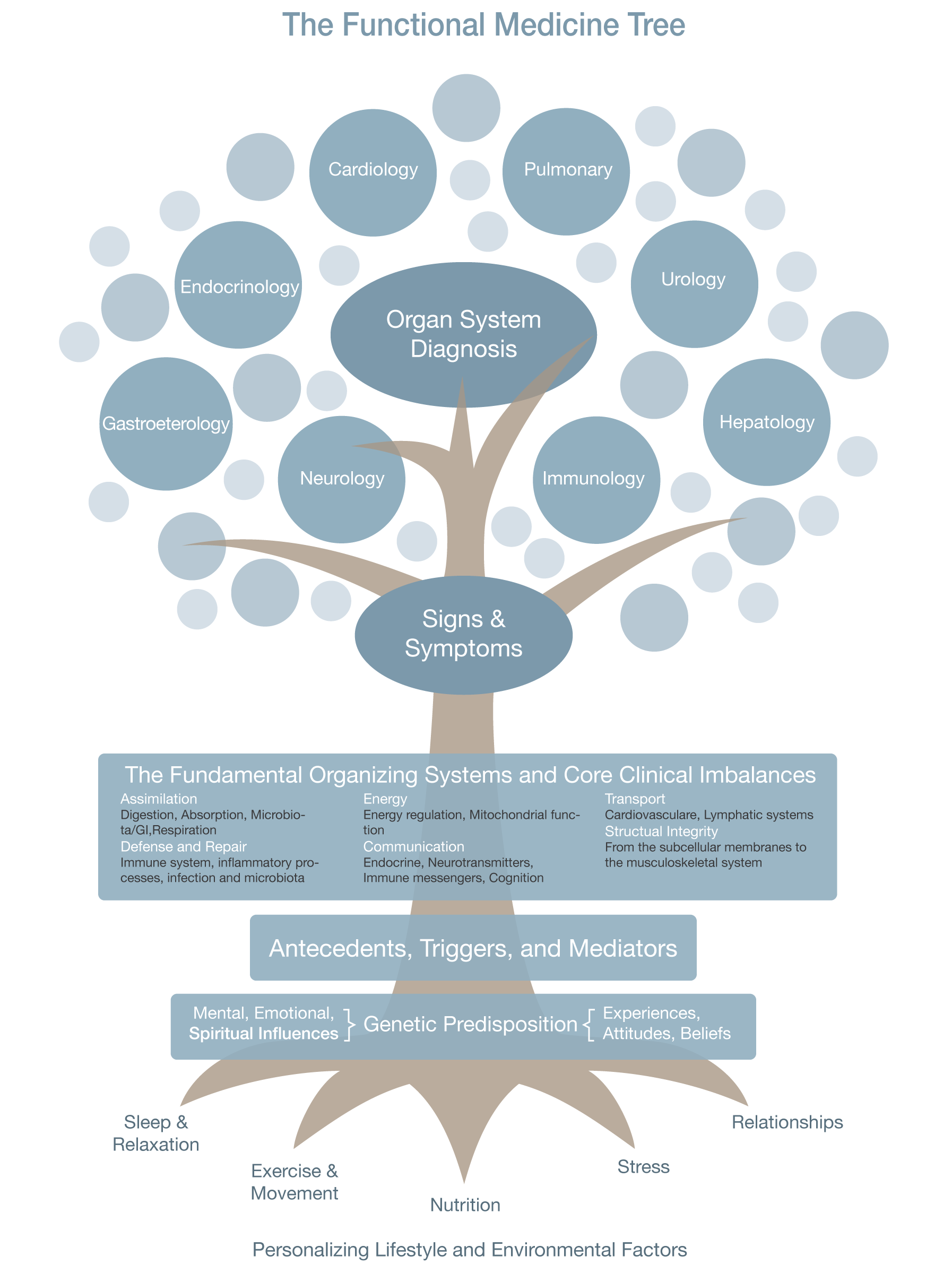 When the roots are influenced by predisposing genetic factors (antecedents), the events that provoke dysfunction (triggers) and others that promote ongoing physiological processes (mediators), it can lead to functional imbalances. If these imbalances are not addressed, it eventually leads to symptoms and disease.